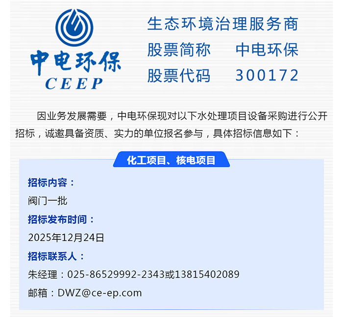 中电环保股份有限公司是南京市首家环保上市公司(股票简称:中电环保,股票代码:300172),南京环保产业协会会长单位,国家级联盟理事长单位,是生态环境治理服务商,主营(3+1):水务、固危废、烟气治理及产业创新平台,包括:工业水处理、污水处理及水环境综合治理;固危废土壤、污泥餐厨垃圾处理;烟气及VOCS治理;智慧环保;高端装备等。